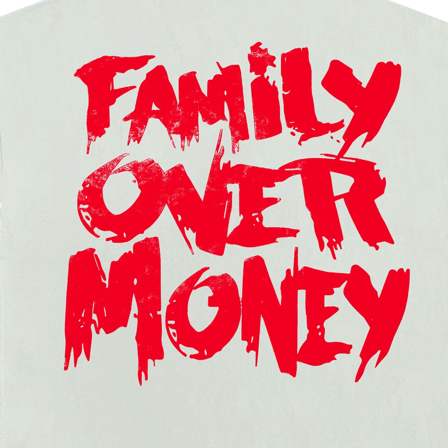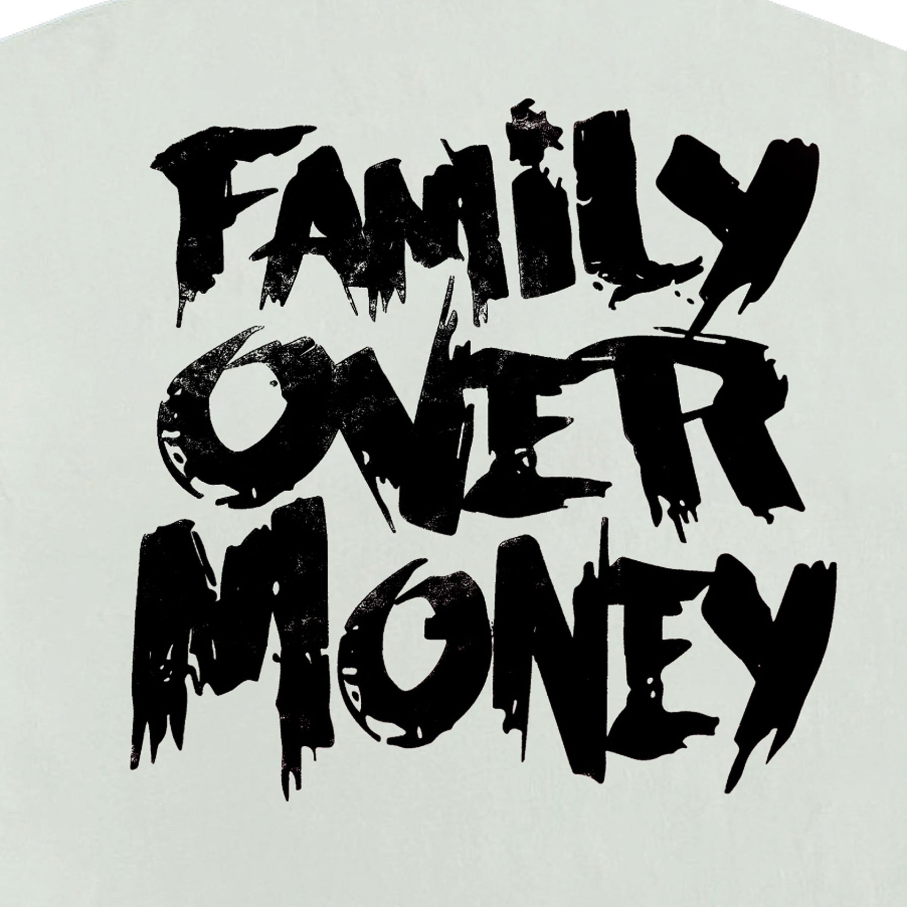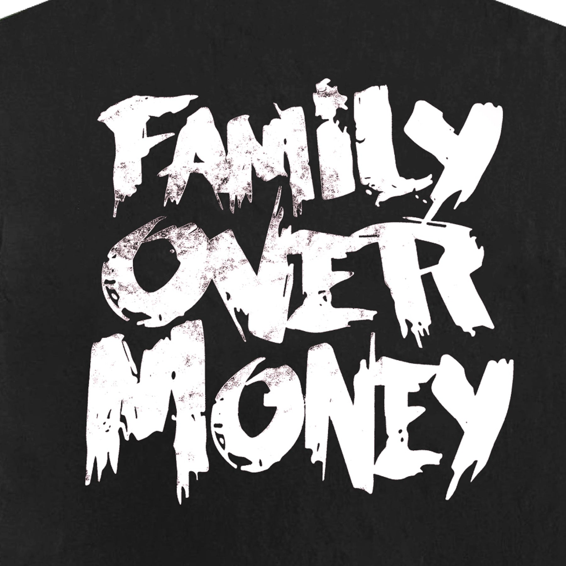On the back A raw, paint drip "Family Over Money" statement that hits like a mural on concrete.