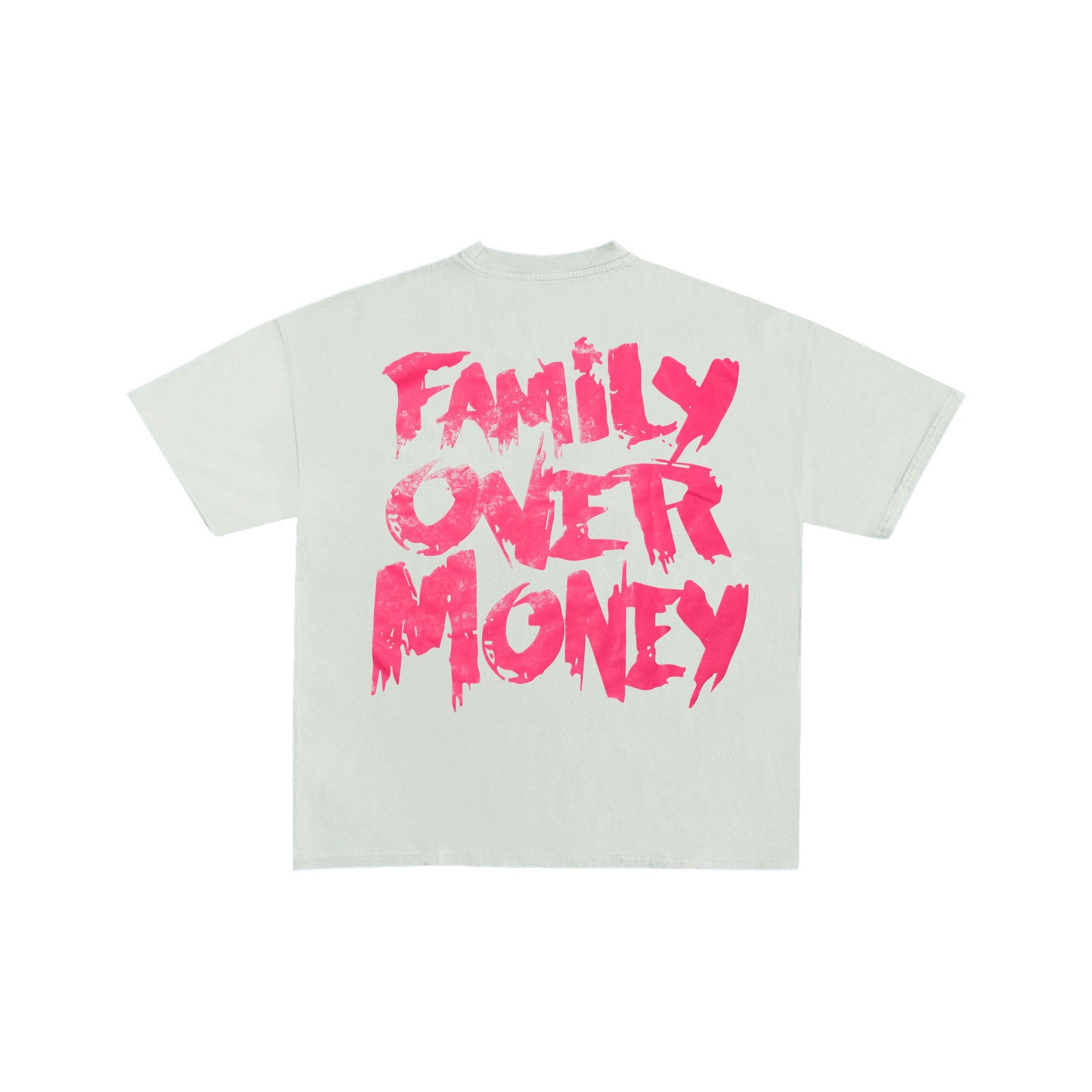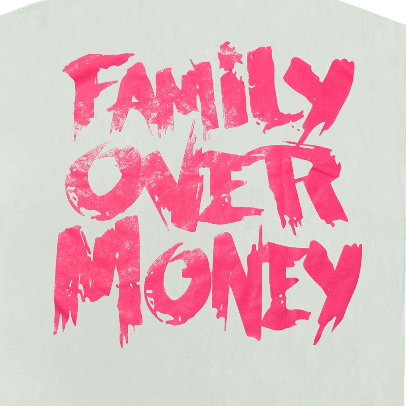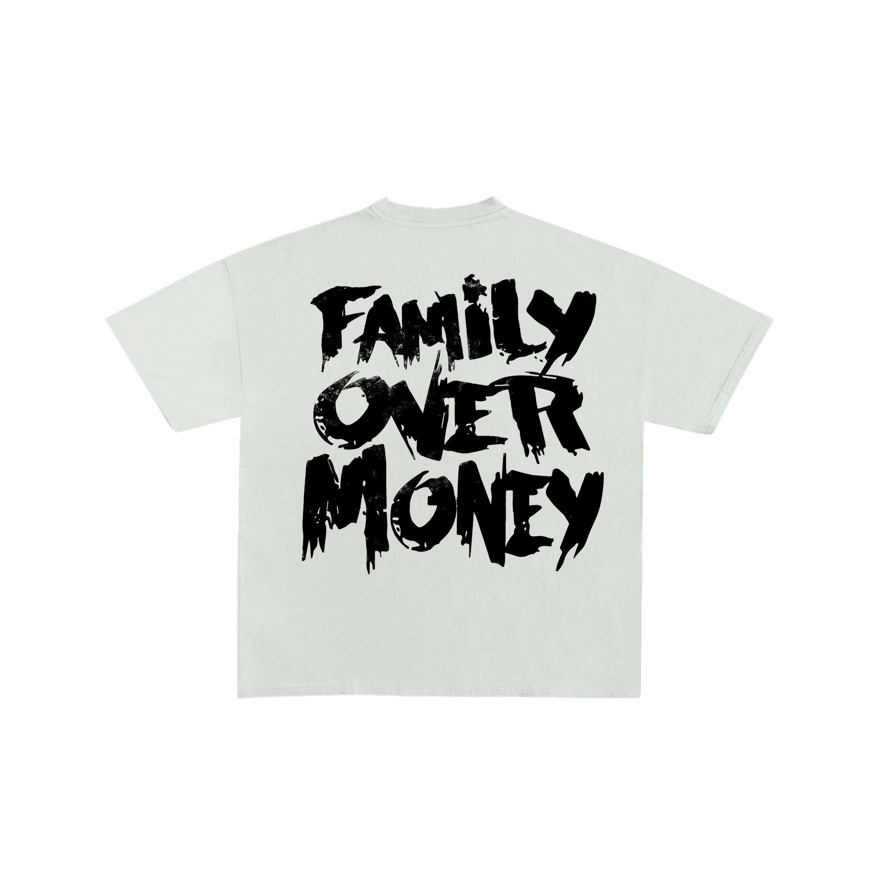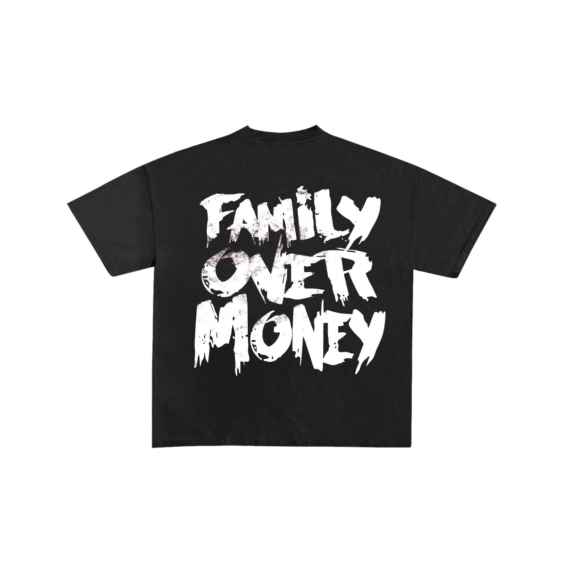 On the back A raw, paint drip "Family Over Money" statement that hits like a mural on concrete.